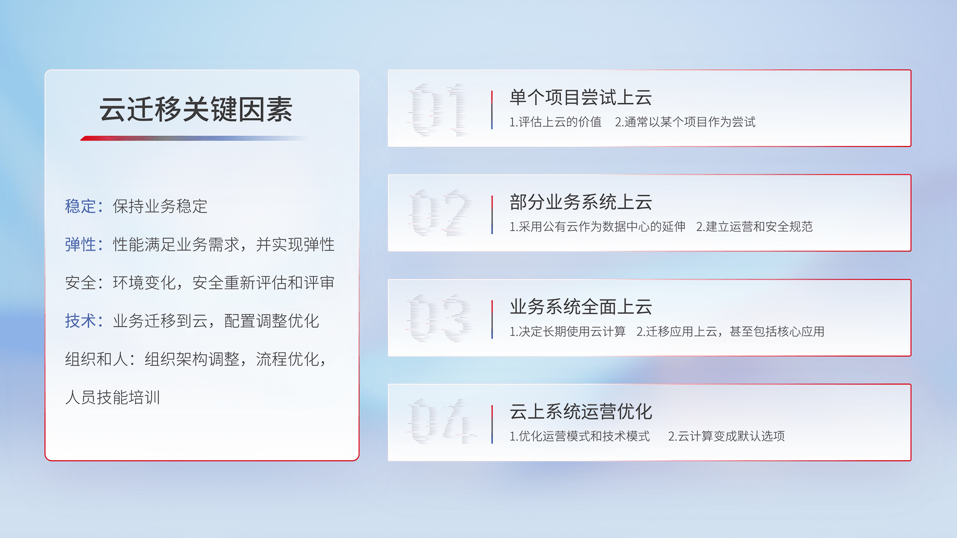 结合实际业务,,从规划设计、、、、云平台选型、、、云原生改造、、、、数据迁移、、、集成交付,,迁移全过程为客户识别最佳上云路径,,,,做好风险识别管理,,,,设计网络架构、、身份权限、、、、安全审计合规、、操作审计、、日志审计、、监控告警策略、、、多站点容灾设计等,,,,对云上基础设施进行整体规划,,,,提升IT治理水平,,以满足弹性、、高可用、、、、高性能的需求。。。。