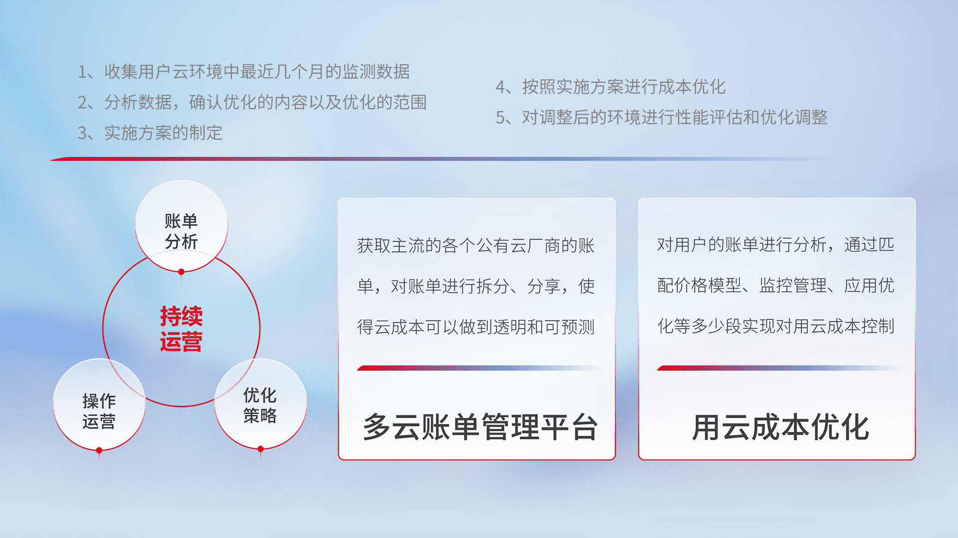 通过多云纳管,,以统一的资源数据模型把客户的云资源进行抽象和封装,,,进而实现对多云资源的统一操作,,保障云资源管理的可靠性、、、、稳定性与可用性。。。。量身定制化运维内容,,,,配置、、、开发运维、、、、补丁管理、、备份、、监控、、、认证和访问管理、、、、审计和日常巡检等,,保障在用云过程中的可靠度,,稳定度以及高可用率。。。